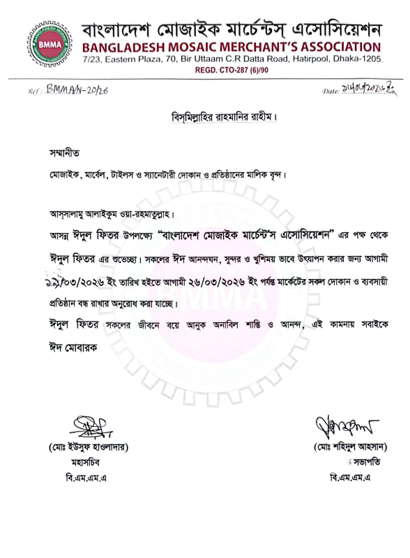 Warmest wishes and heartfelt congratulations on Eid-ul-fitr From “Bangladesh Mosaic Merchant’s Association”